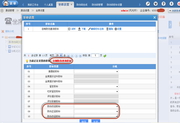 (2)開通了防偽查詢后,系統(tǒng)會(huì)贈(zèng)送彩鈴功能,如圖1,兩項(xiàng)附加功能都開通后,在坐席設(shè)置中即可對(duì)防偽查詢?cè)O(shè)置特質(zhì)彩鈴,如圖2,也可在圖3中進(jìn)行設(shè)置防偽碼彩鈴;
