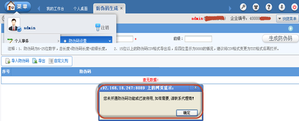 (3) 未開通防偽查詢功能,客戶端無(wú)法進(jìn)入附加功能 >> 防偽碼設(shè)置 >> 防偽碼生成,附加功能 >> 防偽碼設(shè)置 >> 防偽碼管理