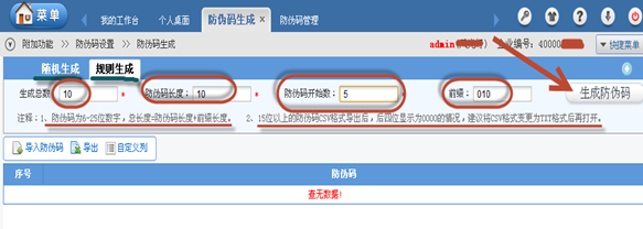 (4)開通防偽查詢功能后,如下頁(yè)面,隨機(jī)生成、規(guī)則生成功能的唯一區(qū)別:規(guī)則生成中增加了防偽碼開始數(shù)的輸入框,將頁(yè)面中輸入框后帶紅色 * 的選項(xiàng)填好后,點(diǎn)擊右側(cè)的生成防偽碼;