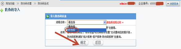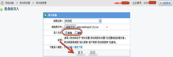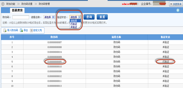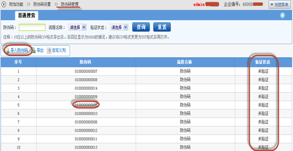 (6)點(diǎn)擊導(dǎo)入防偽碼,確定后在“附加功能 >> 防偽碼設(shè)置 >> 防偽碼管理”中會(huì)新增這10條防偽碼,